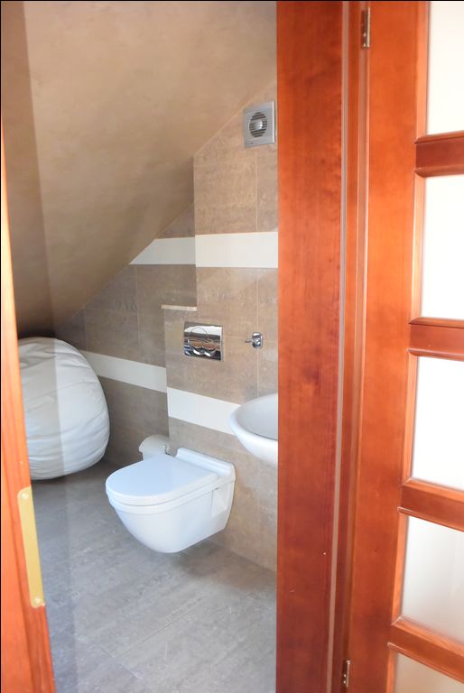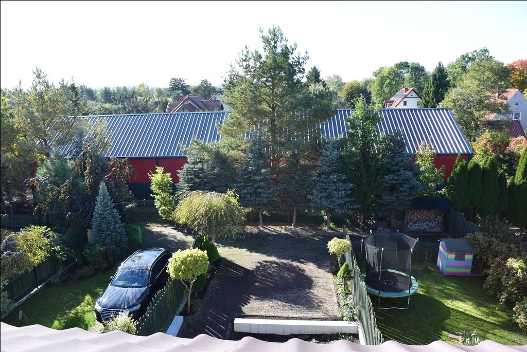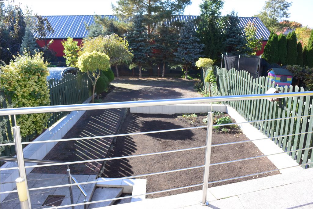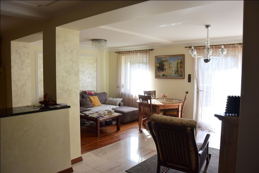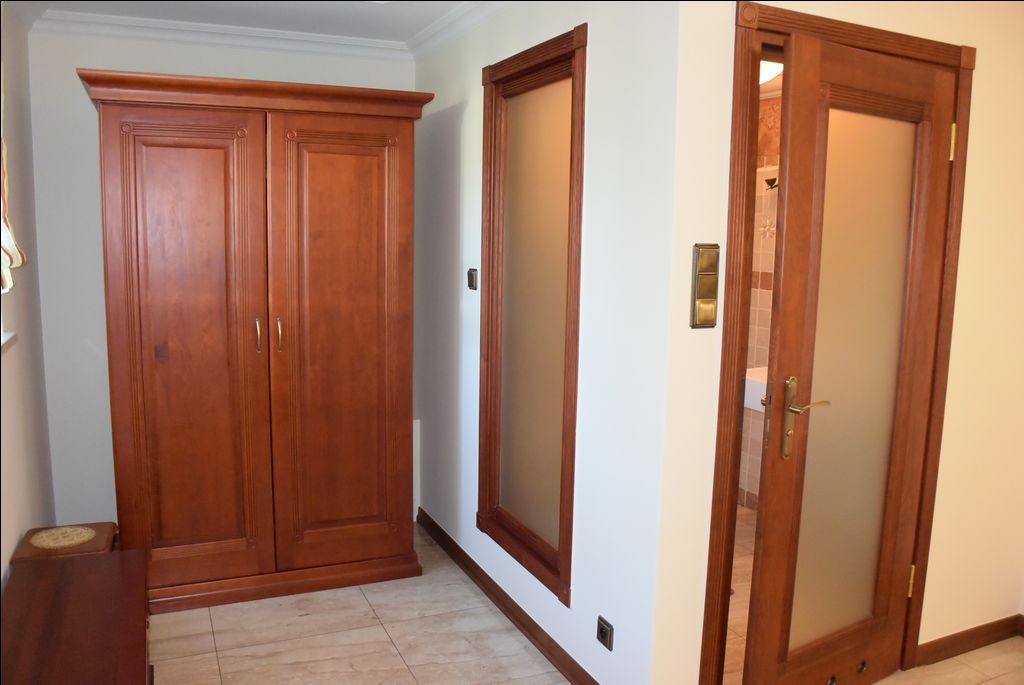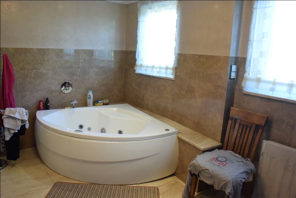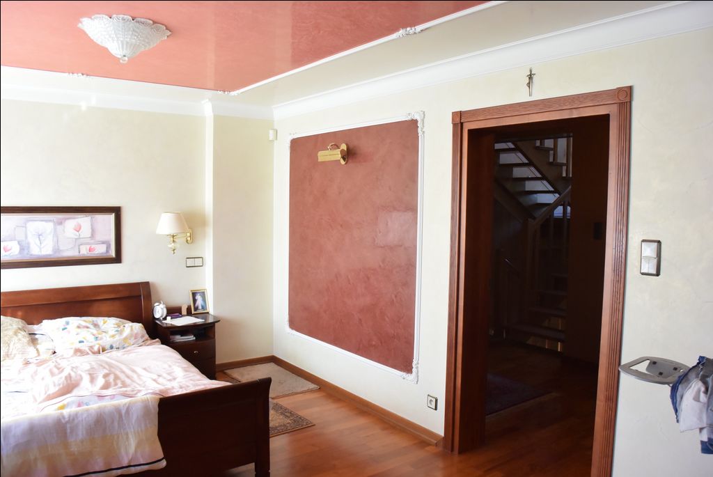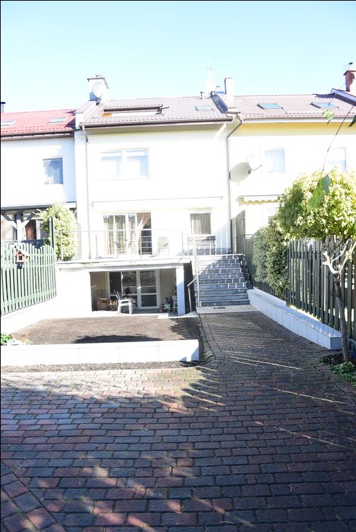 Poziom minus1: biuro z zapleczem,łazienka,wyjście do ogrodu.Piętro -- Duża sypialnia,garderoba,pokój łazienkowy (natrysk z sauną).Drugie piętro -- duża sypialnia z garderobą,łazienka,taras.Schody -- lite drewno.Dużo naturalnych materiałów.Stiuki,trawertyny.W dużej części domu ogrzewanie podłogowe.Parking na 4 samochody + dodatkowe przed osiedlem.